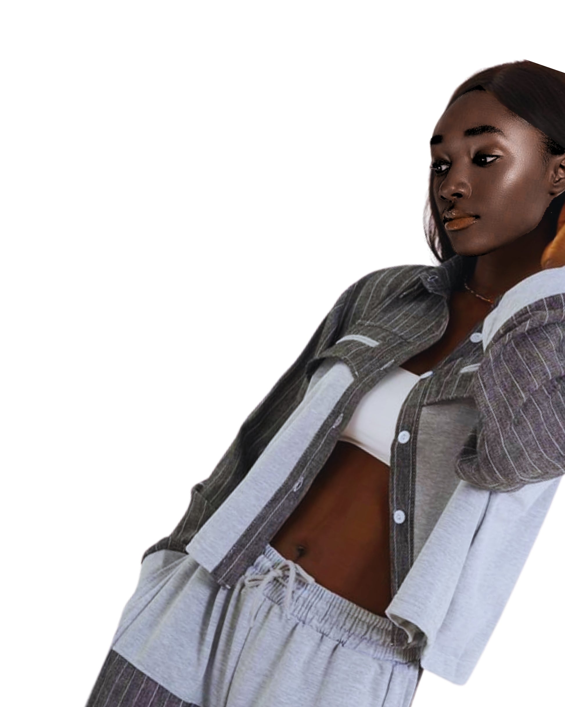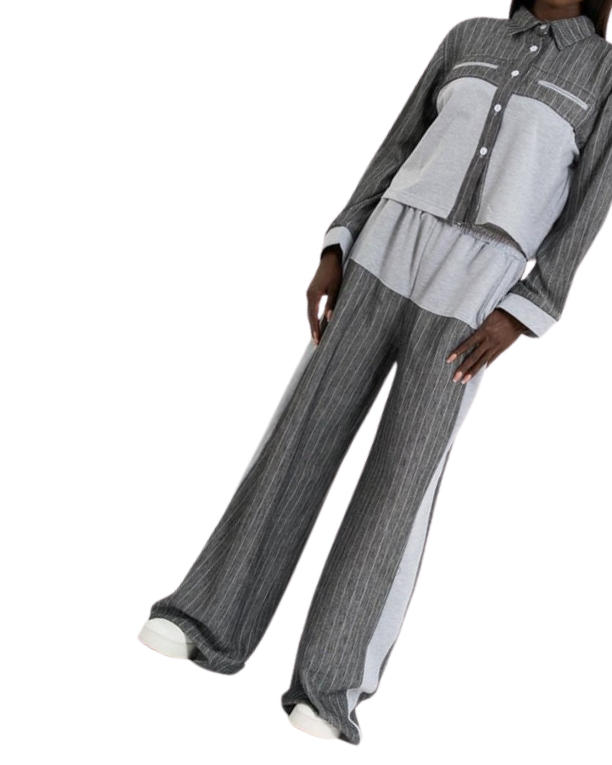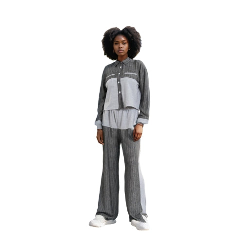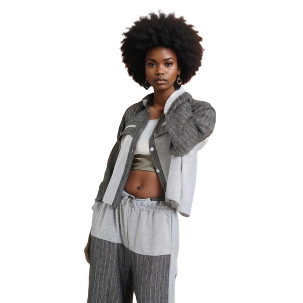 Cet ensemble de sport d'été comprend une veste légère à rayures grises et un pantalon assorti avec une taille élastique, parfait pour un look décontracté et stylé.
